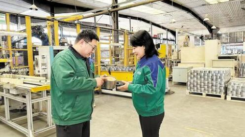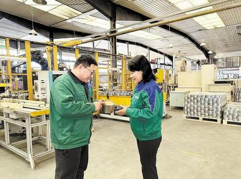 1月3日,在保定市屹马汽车配件制造有限公司生产车间,陈爱玲(右)就完善提案与技术人员交流。记者 徐 华摄