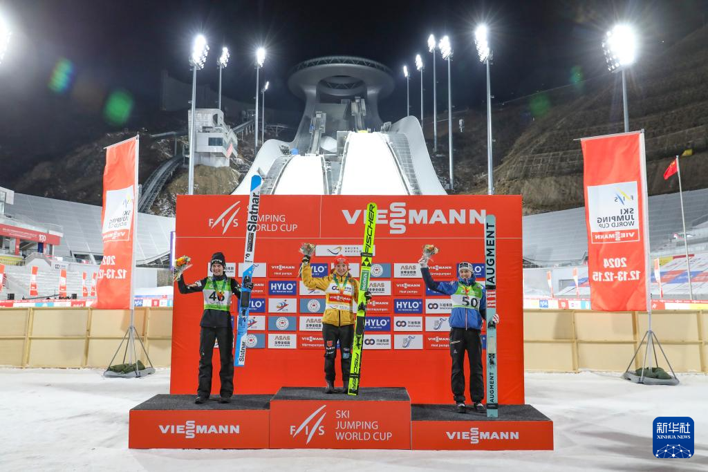 2024年12月15日,2024-2025赛季国际雪联跳台滑雪世界杯女子个人标准台决赛在张家口崇礼国家跳台滑雪中心“雪如意”举行。冠军德国选手卡塔琳娜·施密德(中)、亚军斯洛文尼亚选手埃玛·克莱内茨(左)和季军奥地利选手莉萨·埃德在颁奖台上庆祝。新华社发(武殿森摄)