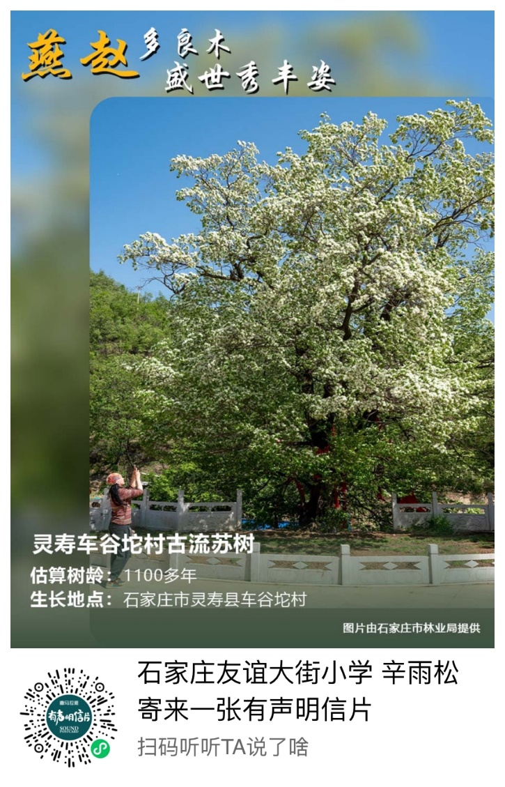 石家庄市灵寿县的车谷坨村有一棵千年古茶树,此树又称“流苏树”,属乌金子茶树。据估算,这棵树的树龄已有1100多年,树高14米,胸围3.5米,平均冠幅19米,曾被评为“河北十佳最美古树”。每年农历三月茶树现蕾,四月盛开,花色洁白如雪,花香沁人心脾。茶树花冲泡的茶水,清香且甘甜。这棵屹立千年的古茶树,如今依然枝繁叶茂,生机盎然。