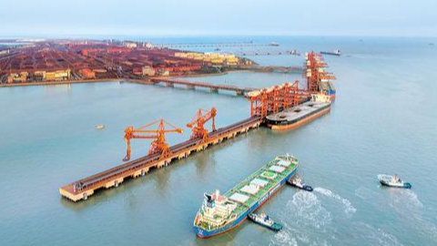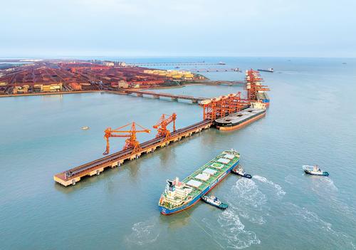 在唐山港,一艘装载巴西铁矿石的货轮经曹妃甸港区减载后,再到京唐港区卸货;