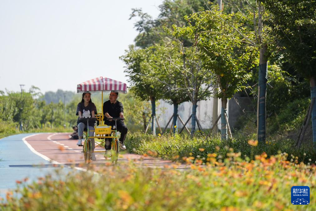 9月28日,市民在河北省乐亭县古滦河生态公园内骑行。