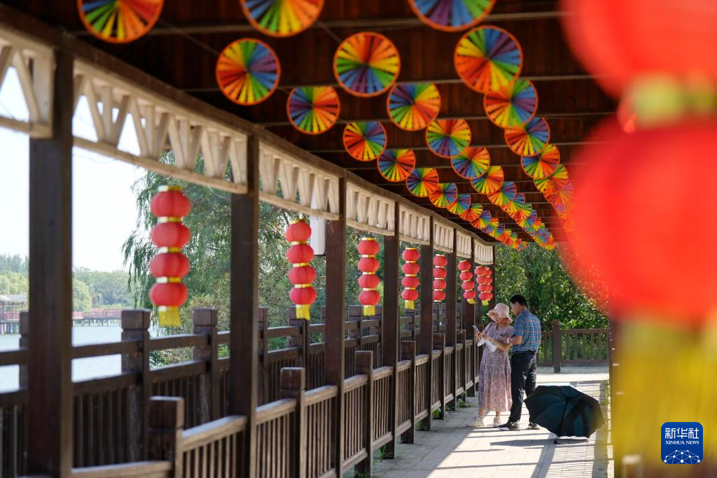 9月28日,市民在河北省乐亭县古滦河生态公园内游览。
