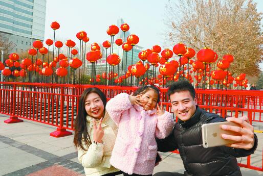 “为了圆满完成本次春节氛围布置工作,长安公园出动工作人员40余人次,作业车辆4辆,在长安公园、人民广场、平安公园、槐北公园等所辖公园广场,共悬挂灯笼2400余个,中国结500余个。”市长安公园副主任乔鹤介绍。
