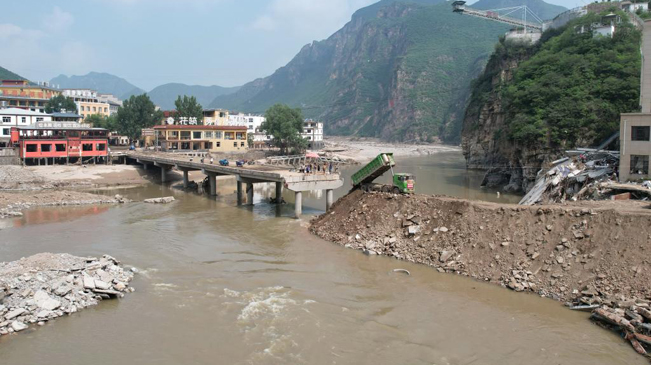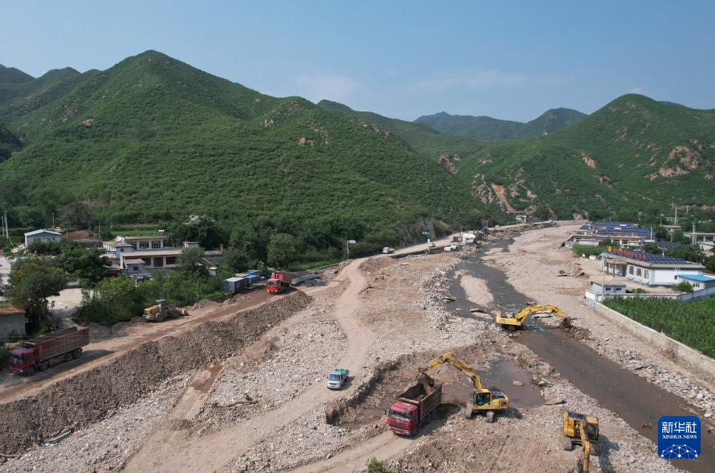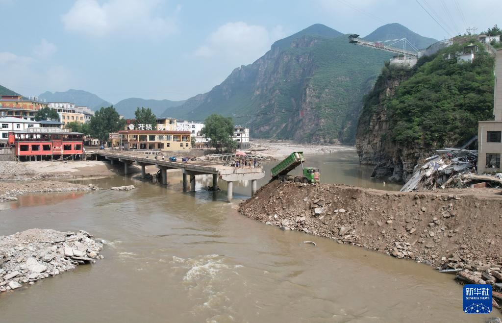 8月9日,工人操作机械设备抢修通往涞水县三坡镇刘家河村的桥梁(无人机照片)。