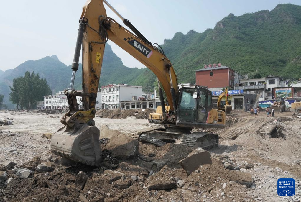 8月9日,工人操作机械设备抢修通往涞水县九龙镇南庄村的道路。