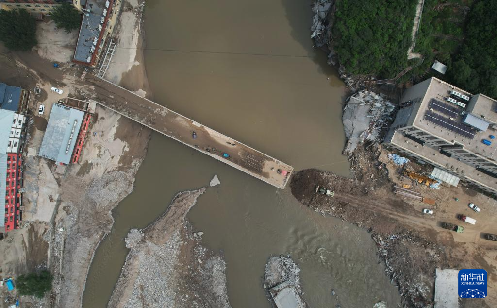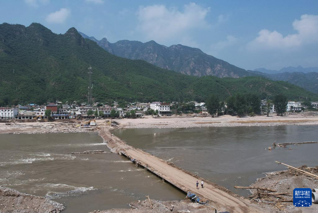 8月9日,涞水县三坡镇上庄村的村民从抢修好的进村桥上通过(无人机照片)。