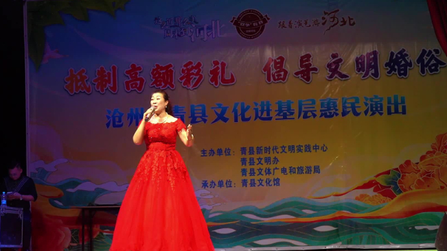 为弘扬文明新风尚,日前,一场主题为“抵制高额彩礼 倡导文明婚俗”的文化进基层惠民演出在河北省沧州市青县石泗河村举行。当晚八点,石泗河村委会门前歌声飞扬、欢声笑语。来自青县的文艺工作者们为村民表演了歌曲、舞蹈、小戏等节目。其中,原创作品评剧小戏《特殊的彩礼》讲述了两位大学生积极响应号召,结婚不要彩礼的故事,引发了现场观众的共鸣。近年来,青县把移风易俗作为文明实践的重要内容,倡导文明健康的生活方式。今年以来,青县共举办惠民演出103场次,服务群众20000多人次。(田金蕊 刘冲)