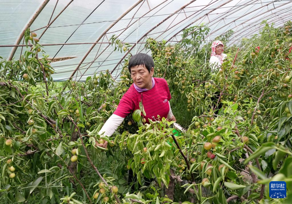 7月21日,河北省黄骅市官庄乡北排村的果农在大棚内采摘冬枣。