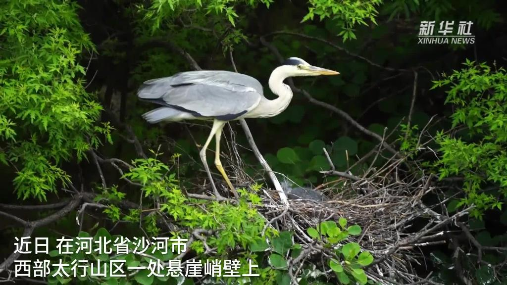 近日,在河北省沙河市西部太行山区一处悬崖峭壁上,近百只苍鹭在这里筑巢、育雏、嬉戏,给初夏的太行山增添了一道生态美景。