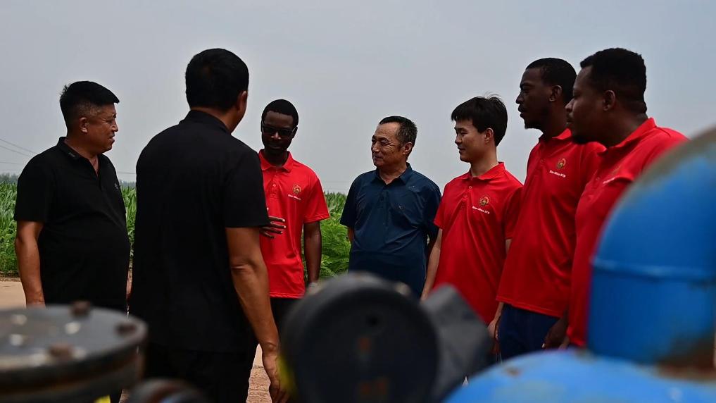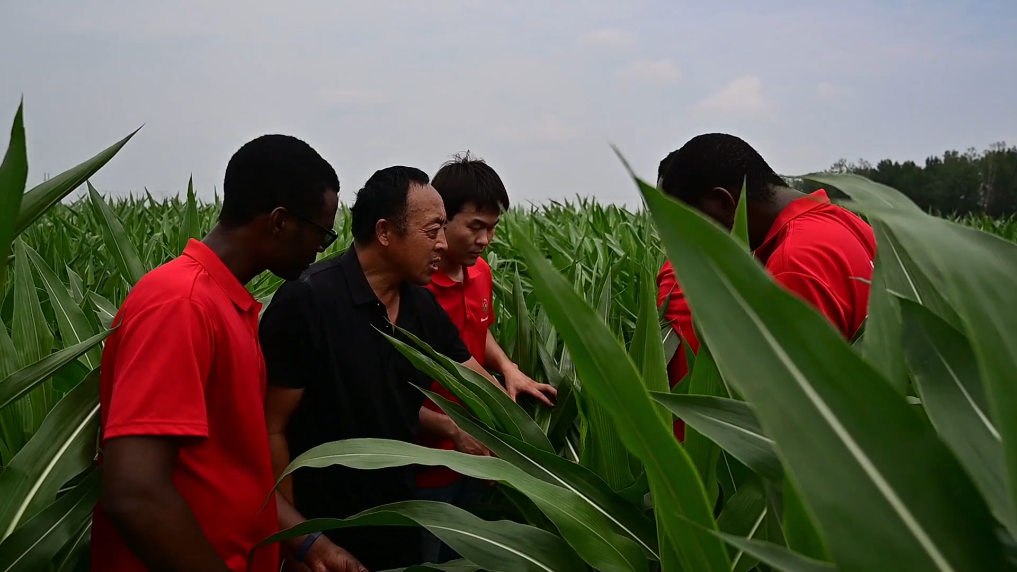 河北省曲周县槐桥镇西漳头村,种植大户任京河正在和非洲留学生们交流玉米施肥注意事项。