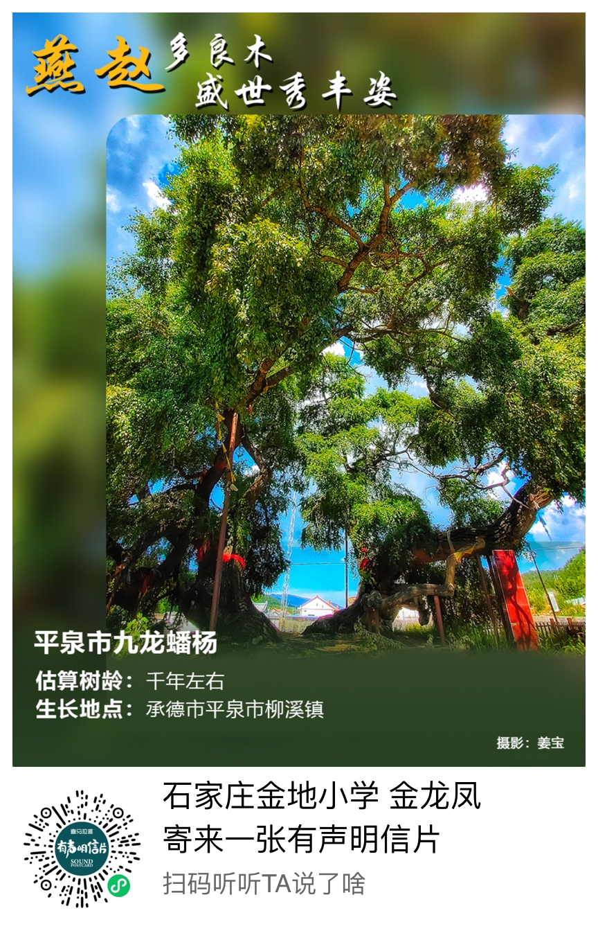 在承德平泉市柳溪镇,有一棵树高20米、树基围19.6米、冠幅33.5米乘20.3米的小叶杨,其树形奇特美观,九条侧干或上扬、或平伸、或俯探,若九龙腾飞,被称为“九龙蟠杨”。据估算,此树树龄已达千年。
