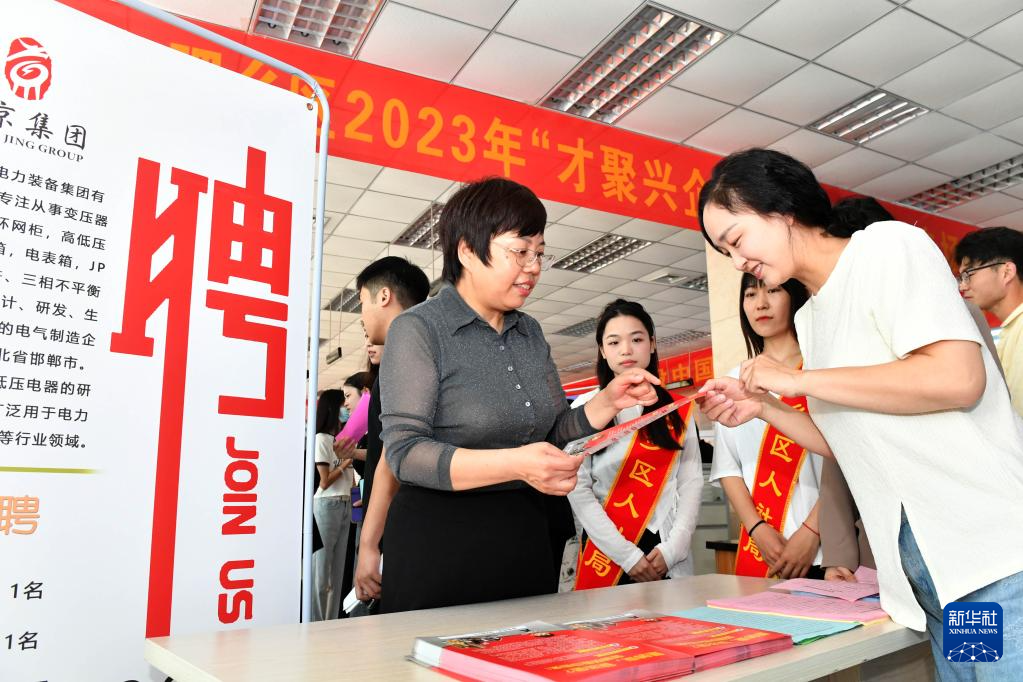 6月3日,在邯郸市肥乡区举行的招聘会上,工作人员向求职者介绍用工情况。