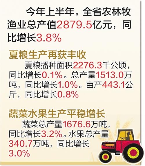 省统计局发布的数据显示,今年上半年,我省农业生产稳定增长。全省农林牧渔业总产值2879.5亿元,同比增长3.8%。夏粮生产再获丰收,总产量1513.0万吨,同比增长1.0%。