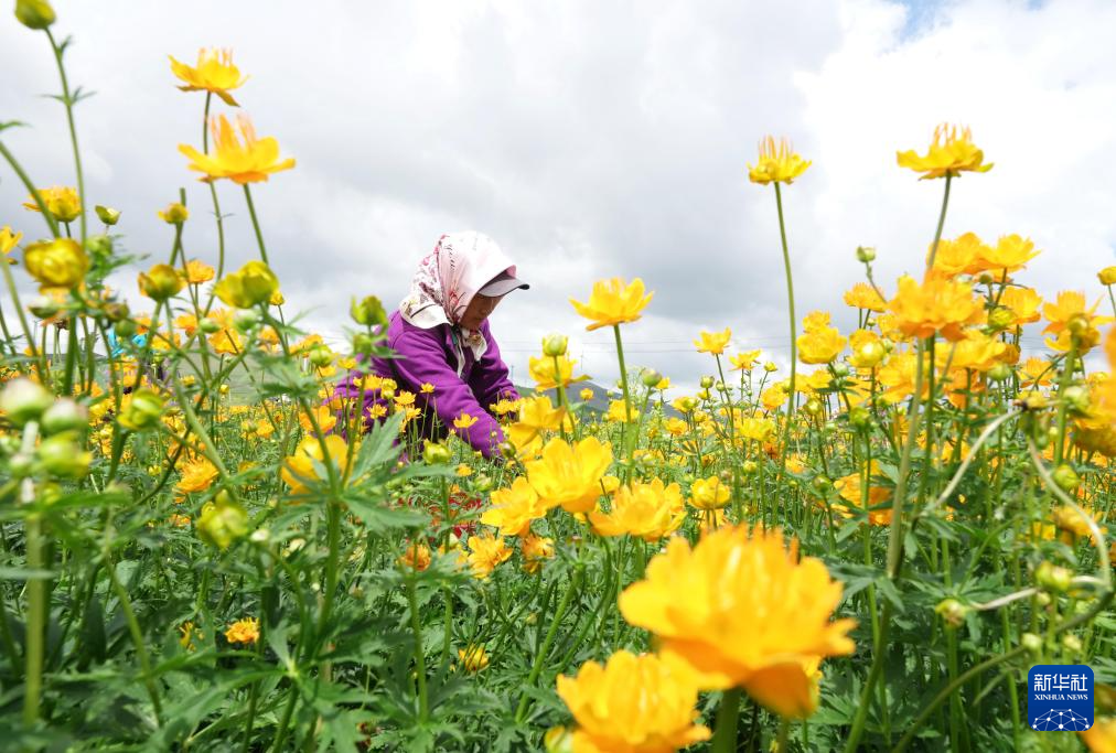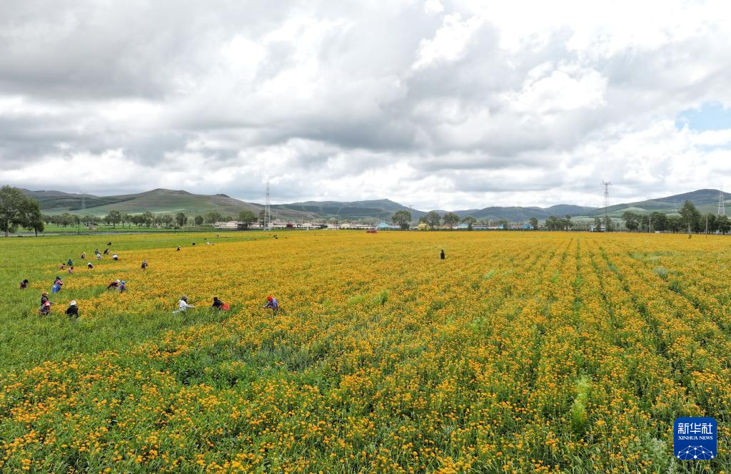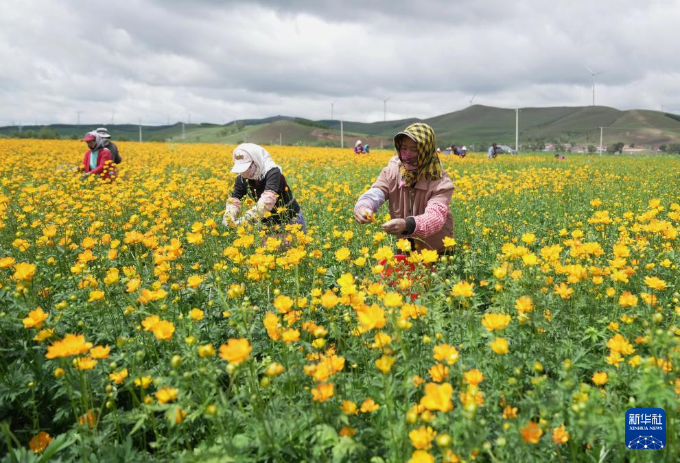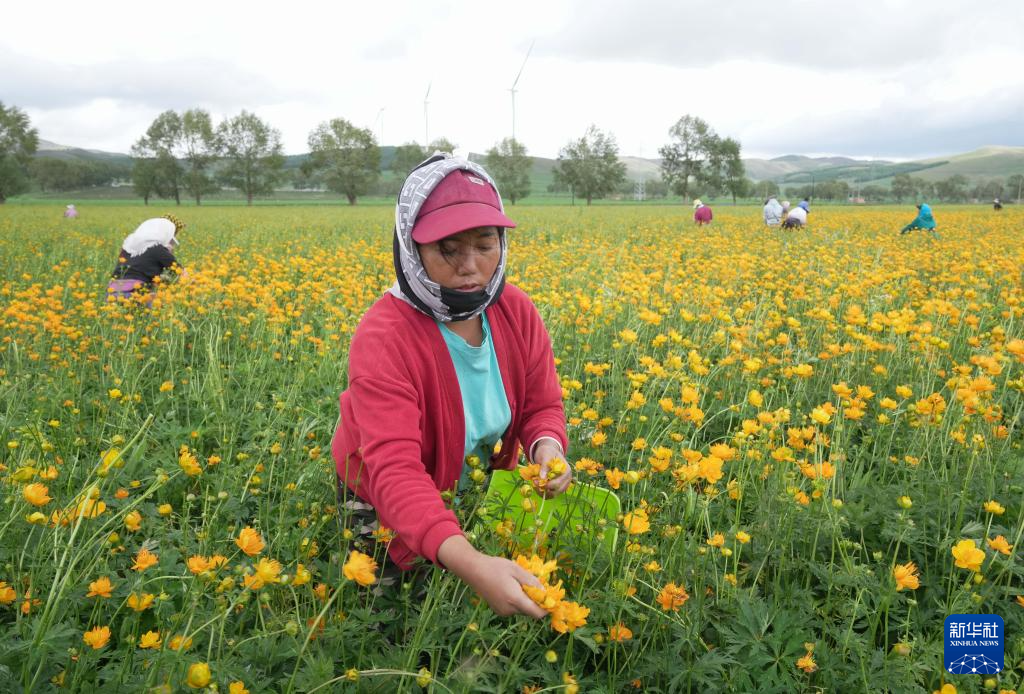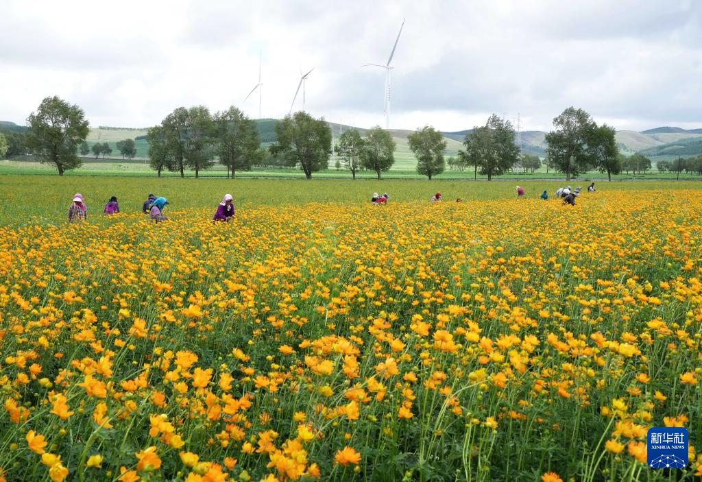 7月14日,河北省沽源县长梁乡兴隆堡村金莲花种植合作社的社员在田间采摘金莲花。