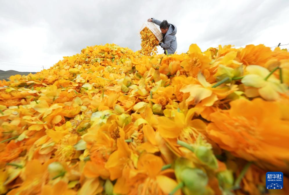 7月14日,河北省沽源县长梁乡兴隆堡村金莲花种植合作社的社员堆放刚采摘的金莲花。