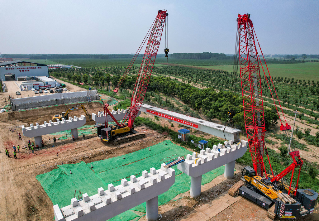 7月10日10时许,雄安新区雄鄚路二期工程燕南长城大桥首片箱梁正在架设。记者 李东宇摄