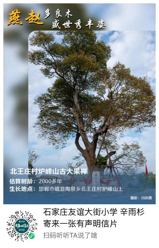 在邯郸市磁县陶泉乡的炉峰山上,海拔950米处,有一棵高14米、胸围4.3米的大果榉,是榆科、榉属乔木,生长旺盛,树体硕大,覆盖面积可达300平方米。在大果榉树干分枝处,有一株自然生长的油松,形成了天然的“榆抱松”景观。据估算,它的树龄已有2000多年,虽经历多次自然灾害,仍枝繁叶茂,健壮地屹立在炉峰山上。