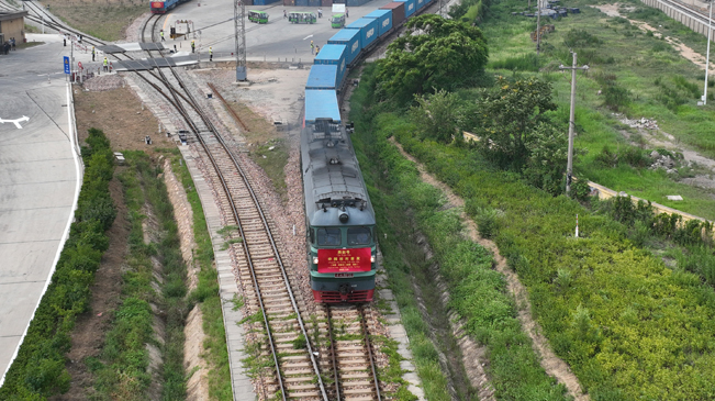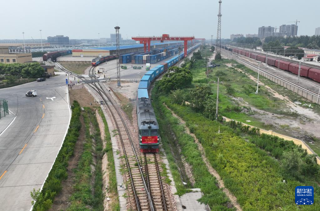 7月24日,“燕赵号”中越班列从河北省石家庄国际陆港驶出(无人机照片)。