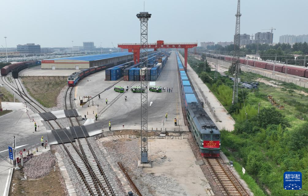 7月24日,“燕赵号”中越班列(右)从河北省石家庄国际陆港驶出(无人机照片)。