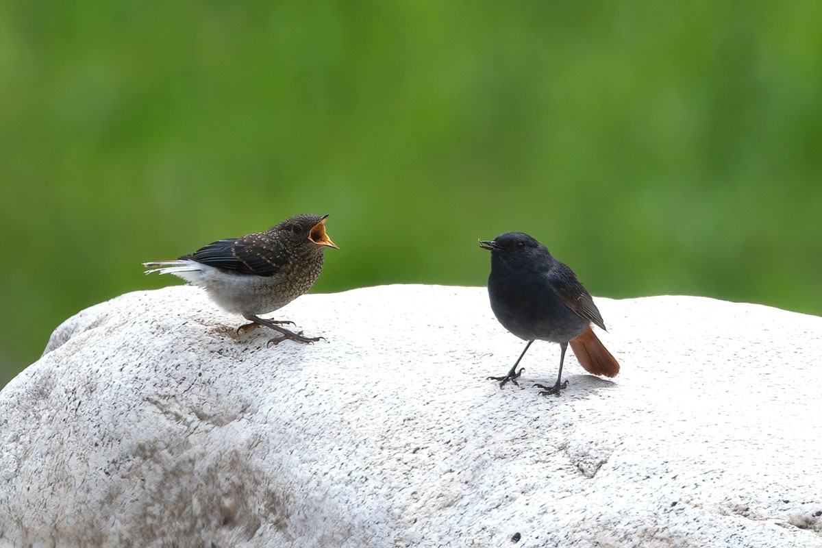 红尾水鸲雌雄异色,雄鸟通体是灰蓝色,尾部呈红色;雌鸟上体是灰褐色,下体呈灰色,杂以不规则的白色细斑。