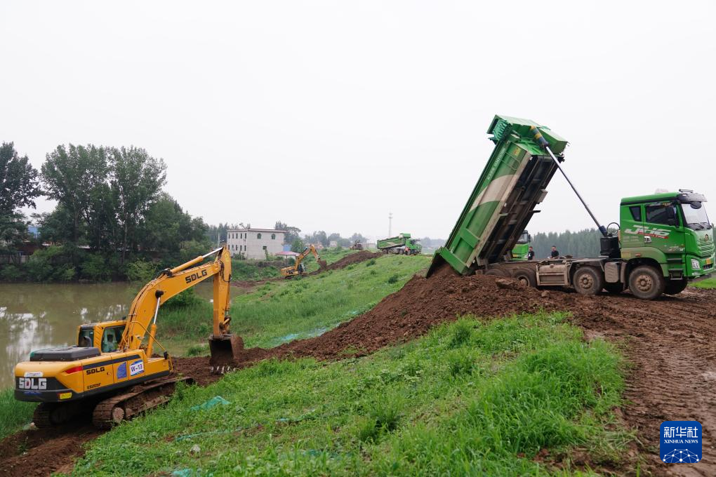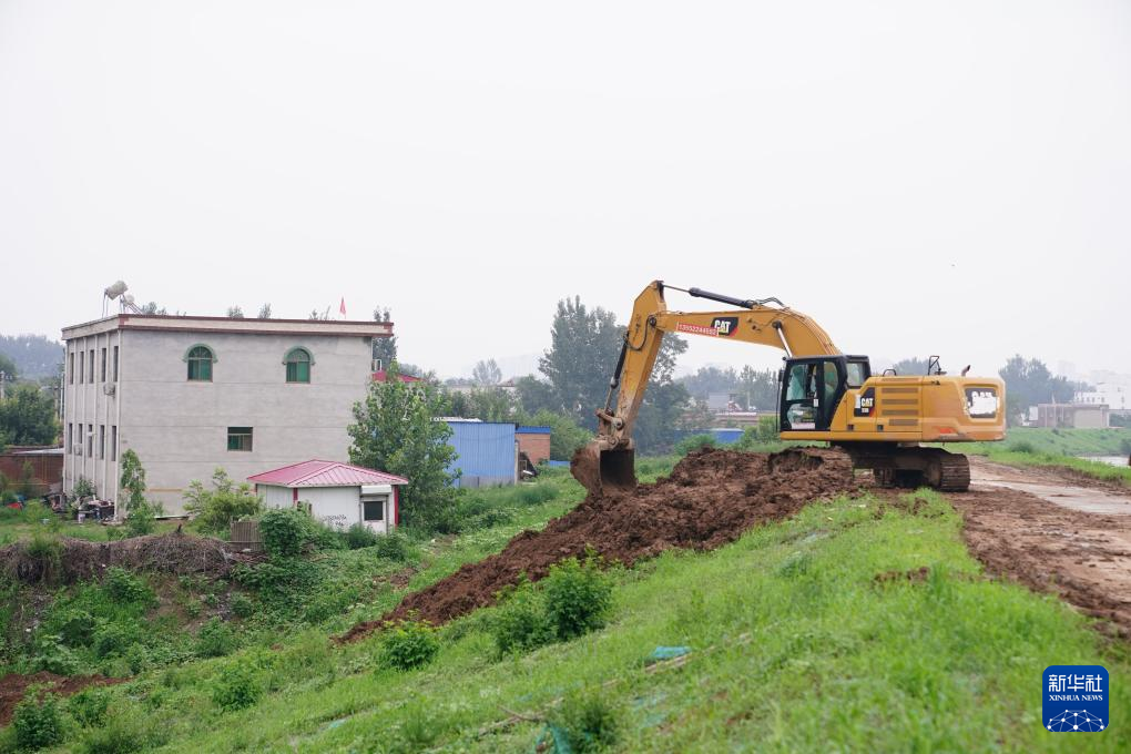 8月4日,工人操作机械在白沟河左堤白沟新城高桥村段进行除险加固作业。