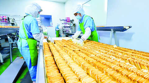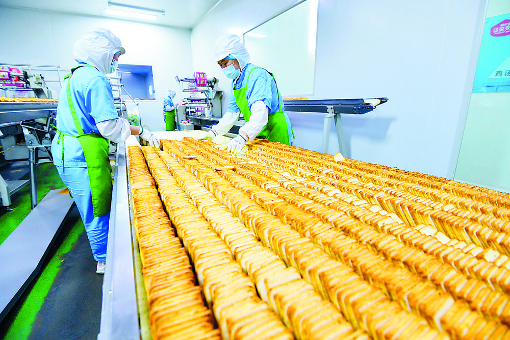 图为在位于石家庄市栾城区的河北马家麦坊食品有限公司生产车间,工人进行馍片包装作业。