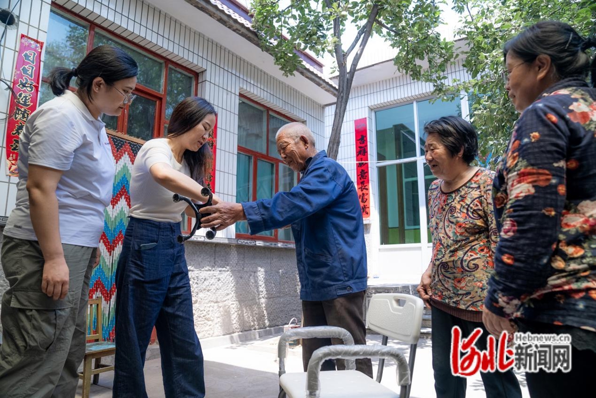 图为工作人员给小作村杜大爷送去四脚手杖和沐浴椅,并讲解使用方法。