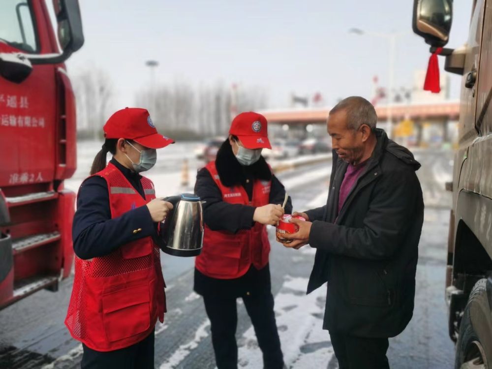 ↑12月11日,河北高速集团石黄分公司志愿服务小队在站口为滞留司乘送食物和热水。