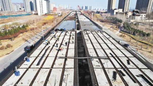 这一快速连通工程全长约4.8公里,主要新建仙台街至天山大街连续高架桥、昆仑大街跨线桥、秦岭大街和太行大街跨线桥。目前,主桥桩基、承台、墩柱、盖梁、箱梁架设全部完成。