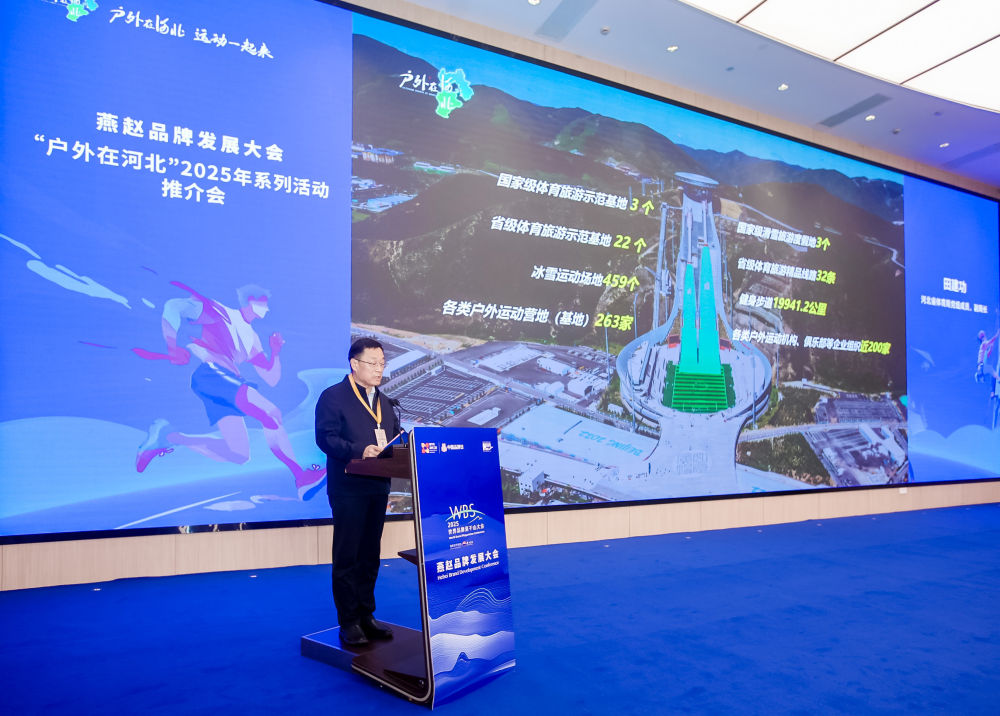 ↑5月9日,河北省体育局副局长田建功在活动现场推介“户外在河北”2025年系列活动。