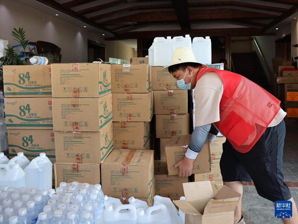 8月15日,工作人员在河北涞水县三坡镇防汛救灾临时指挥部搬运消杀物资。