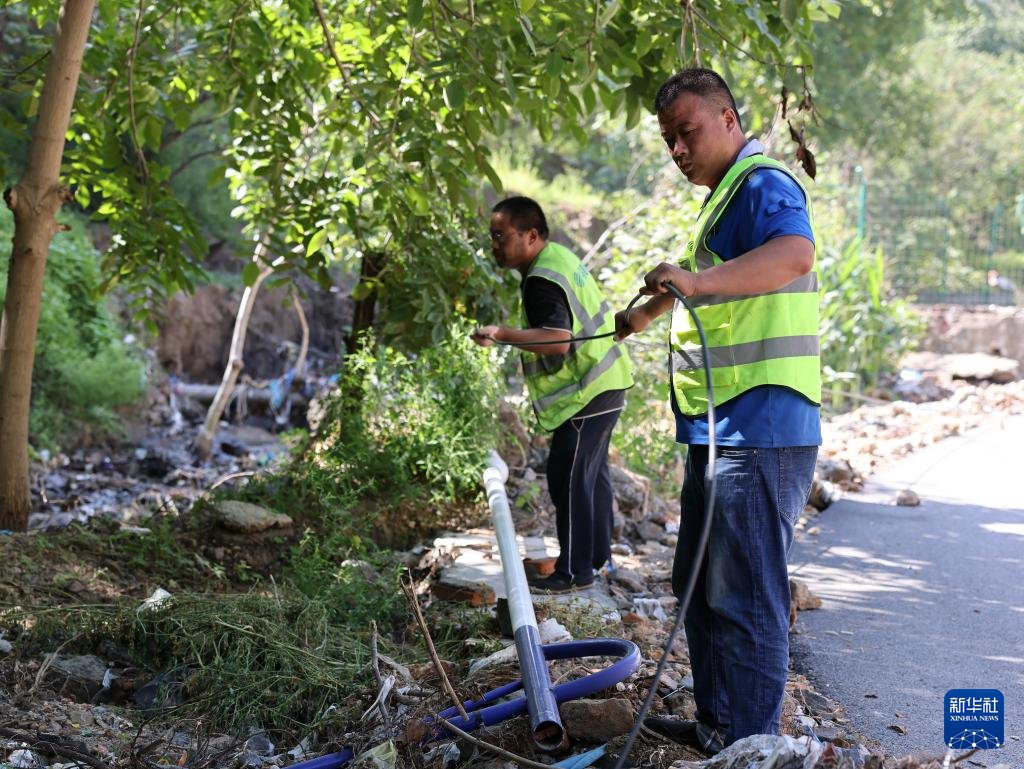 8月16日,通信公司施工人员在河北涞水县九龙镇大泽村抢修通讯设施。