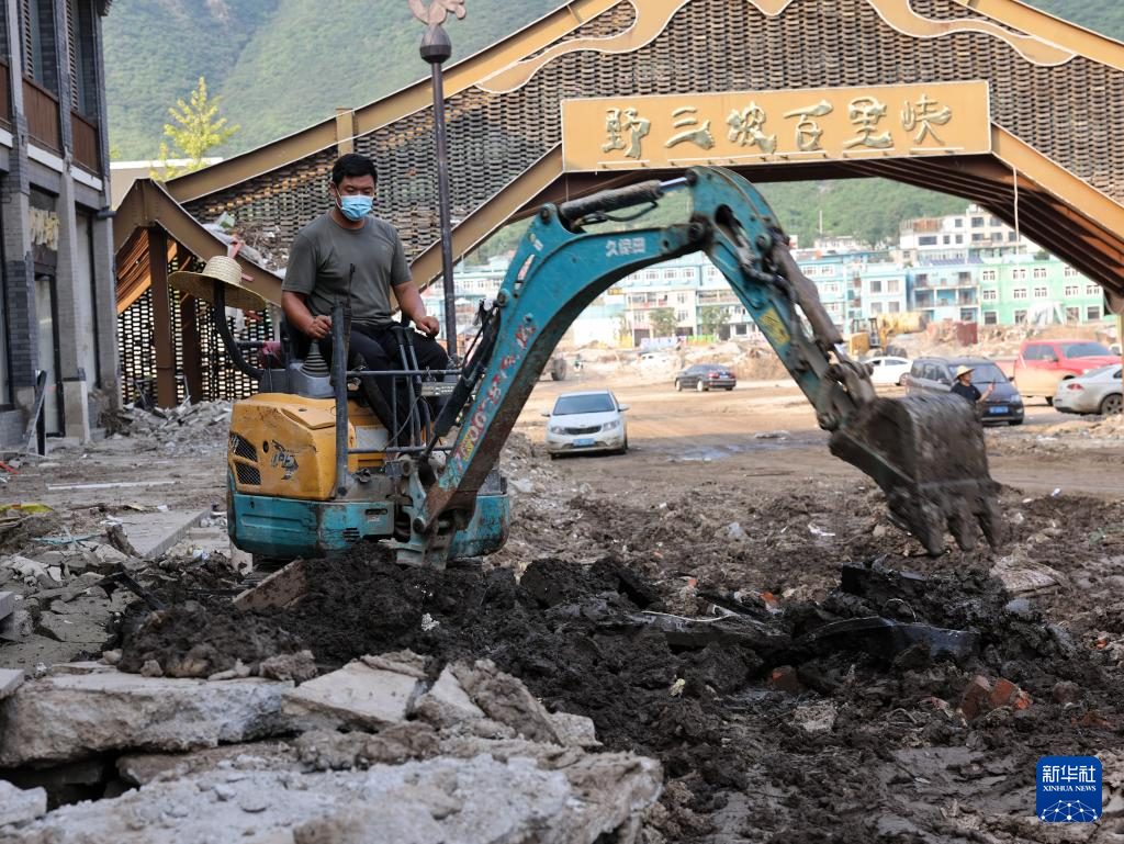 8月15日,工作人员驾驶机械在河北涞水县野三坡百里峡景区清理排水沟。