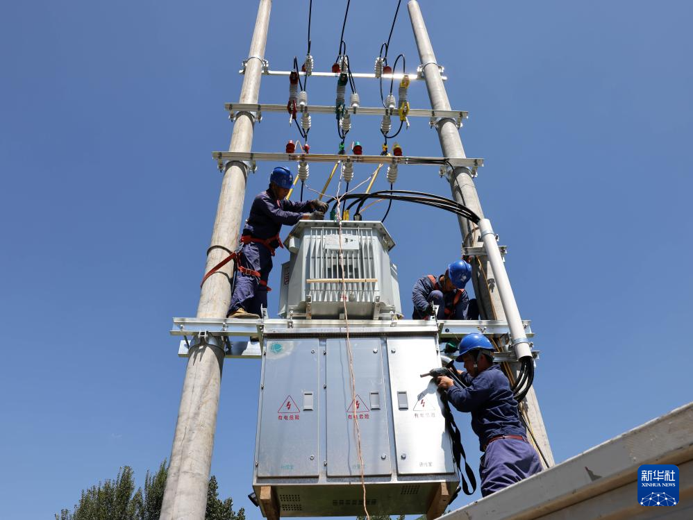 8月16日,电力公司施工人员在河北涞水县九龙镇北龙门村抢修电力设施。