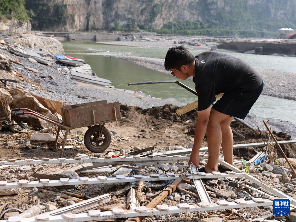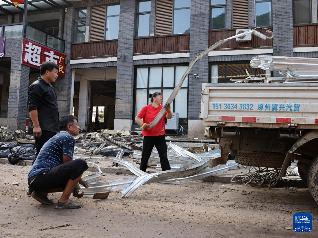 8月16日,河北涞水县九龙镇北龙门村村民在收拾清理家中物品。