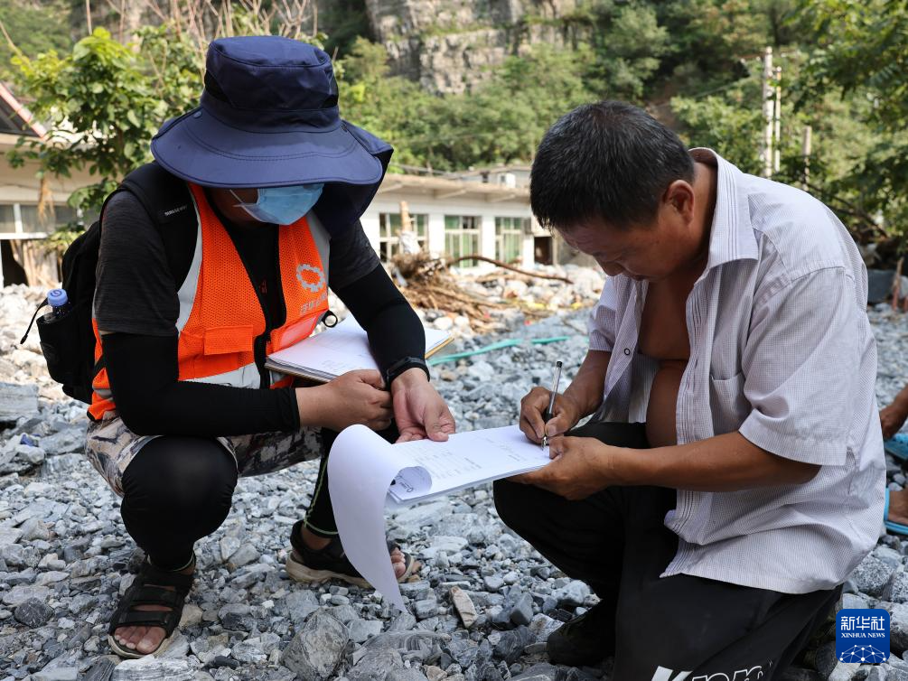8月15日,保险评估公司工作人员(左)在河北涞水县三坡镇都衙村四背峪村民小组登记评估村民灾后损失情况。