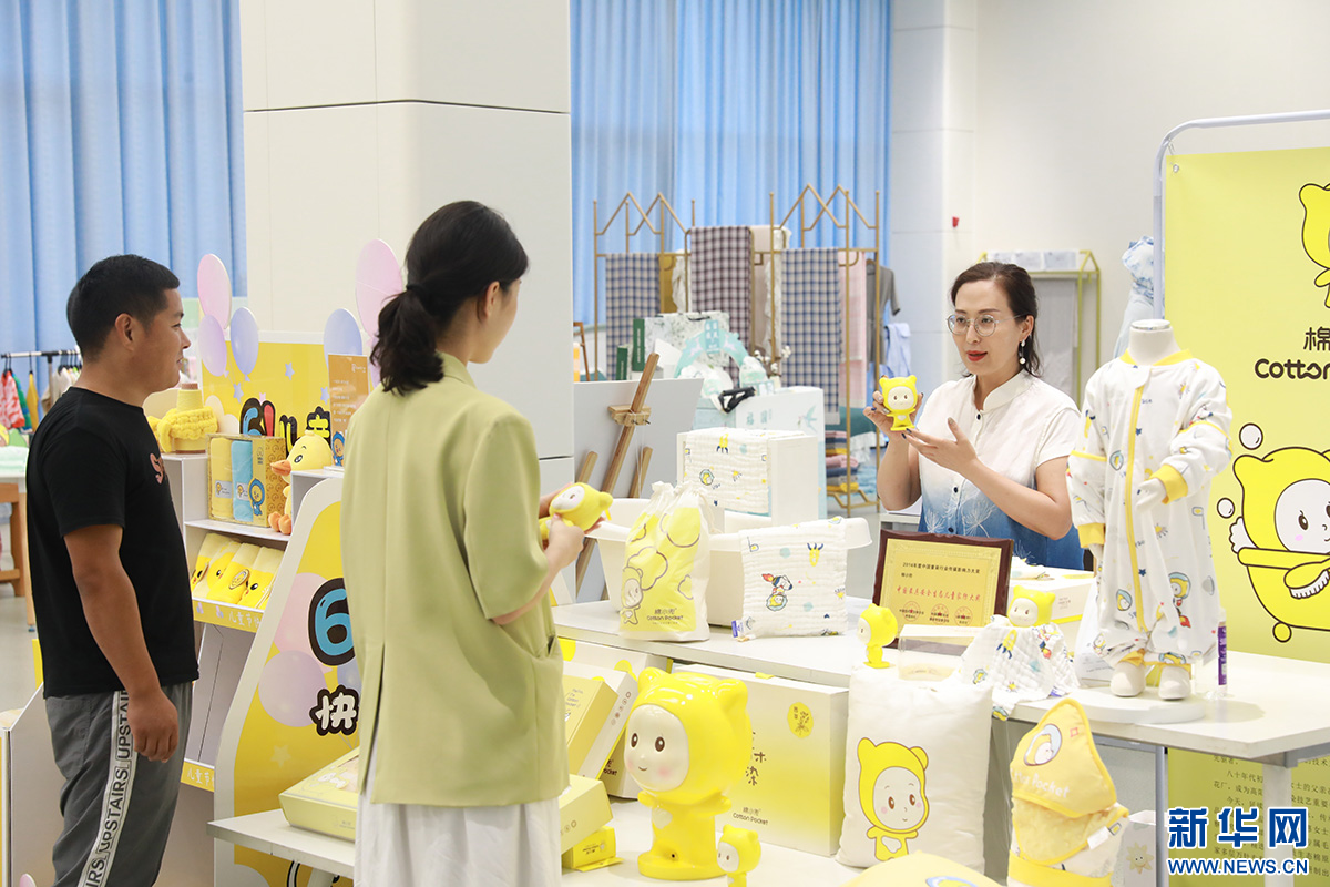 河北永亮纺织品有限公司工作人员(右一)展示毛巾文创产品。沈齐 摄
