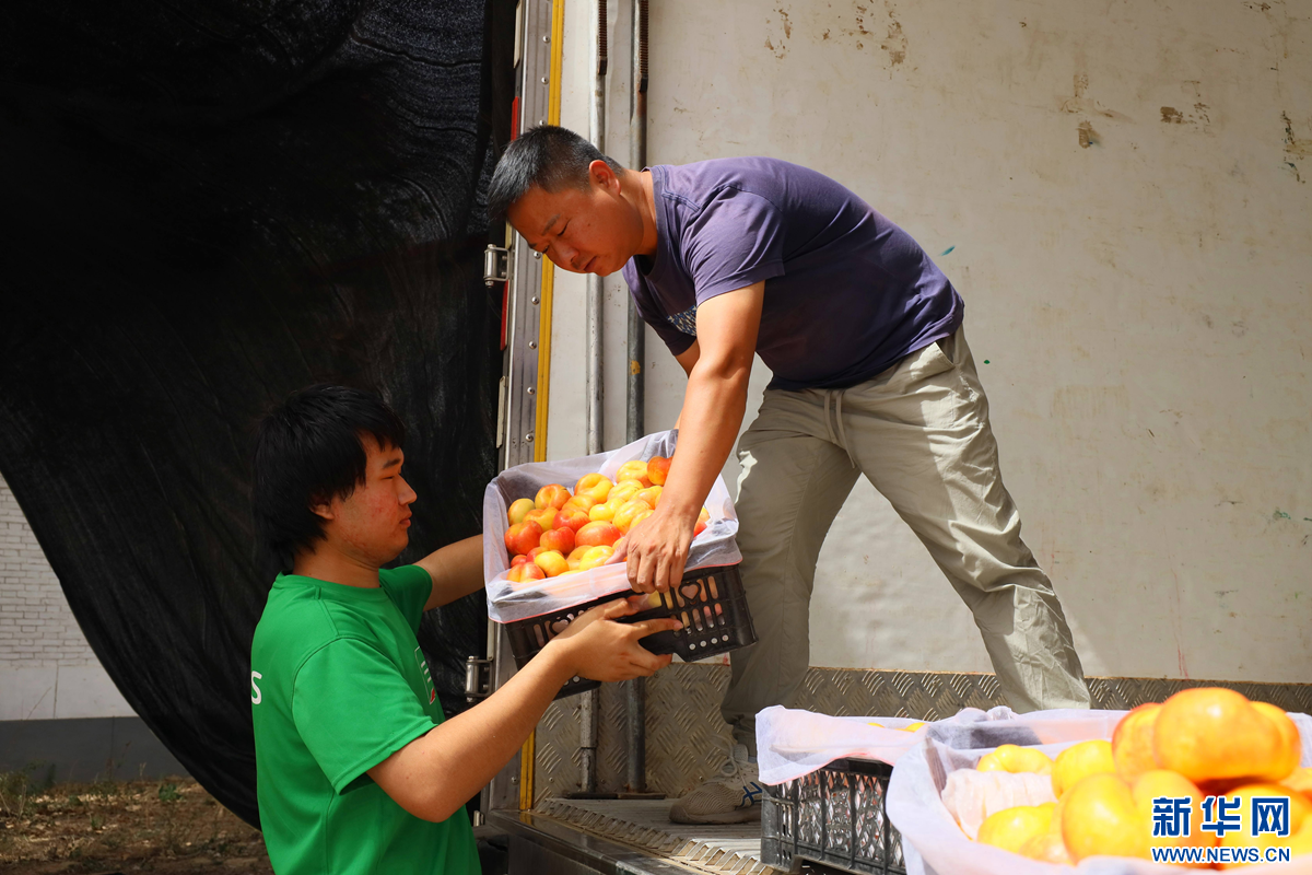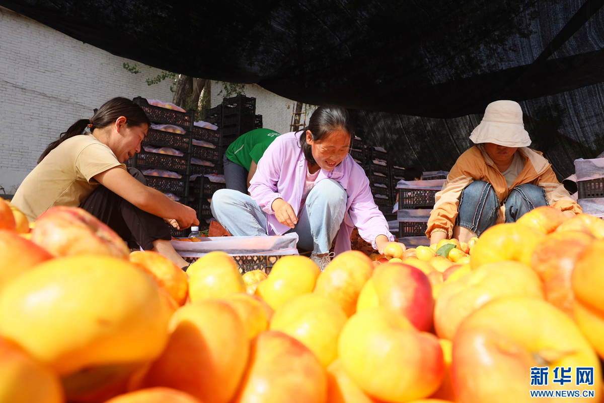 在南宫市大高村镇刘孟村油蟠桃种植基地,果农们对采摘的油蟠桃进行装箱。新华网发 田优 摄