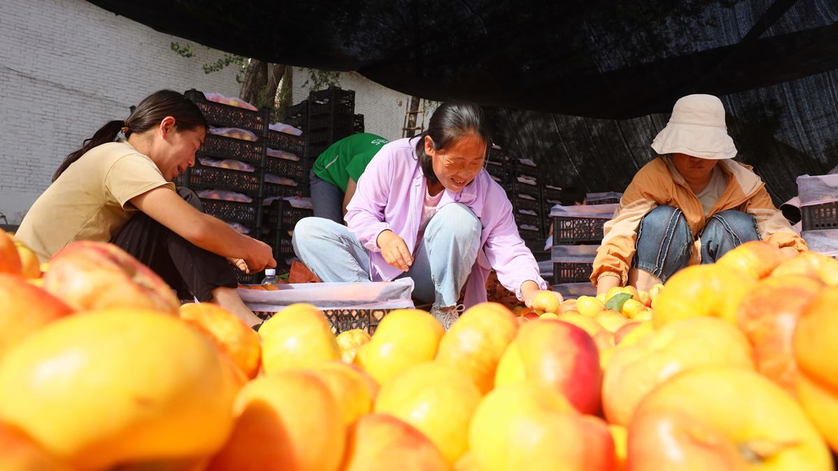 在南宫市大高村镇刘孟村油蟠桃种植基地,果农们在分拣刚采摘下来的油蟠桃。新华网发 田优 摄