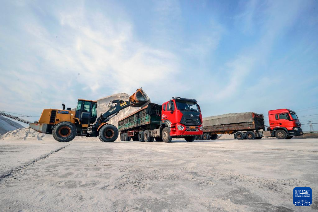 6月4日,工人操作设备在唐山海港经济开发区长芦大清河盐场将海盐装车,准备外运。