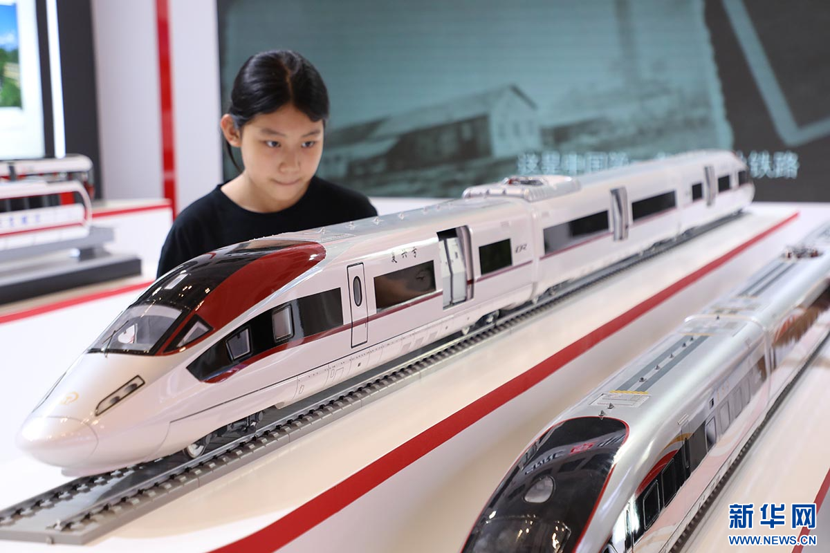 一名参观者被复兴号列车模型吸引。新华网 王立鹏 摄