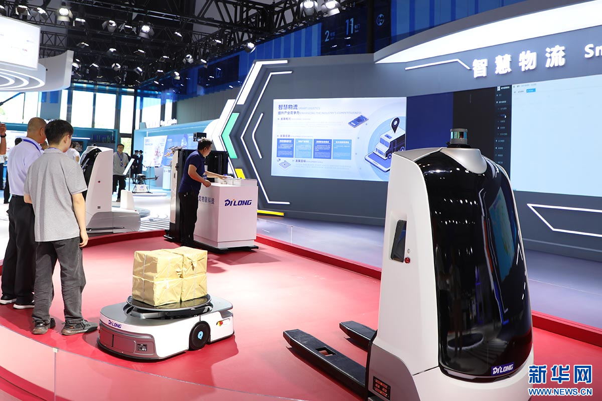 在智慧物流展区,智能运输车在进行货物搬运演示。新华网 王立鹏 摄