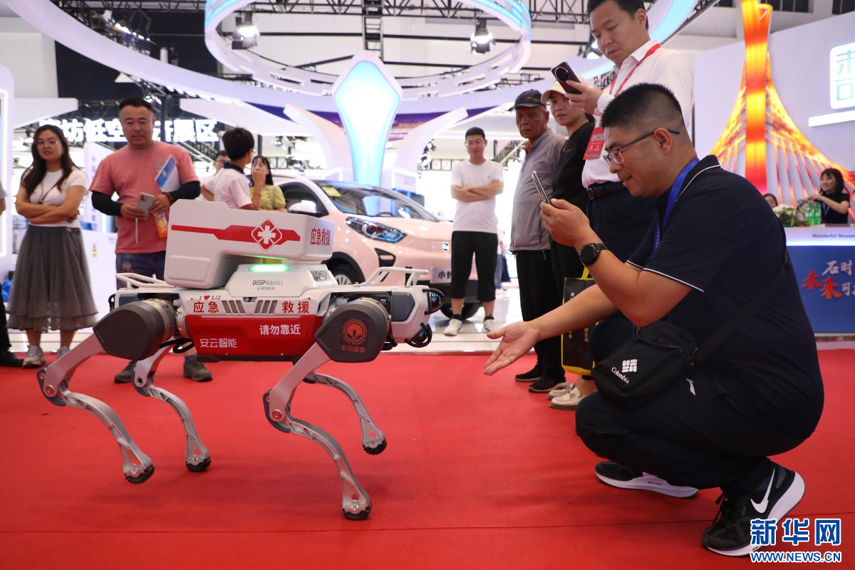 在石家庄展区前,参观者与四足行业应用机器人互动。新华网 王立鹏 摄