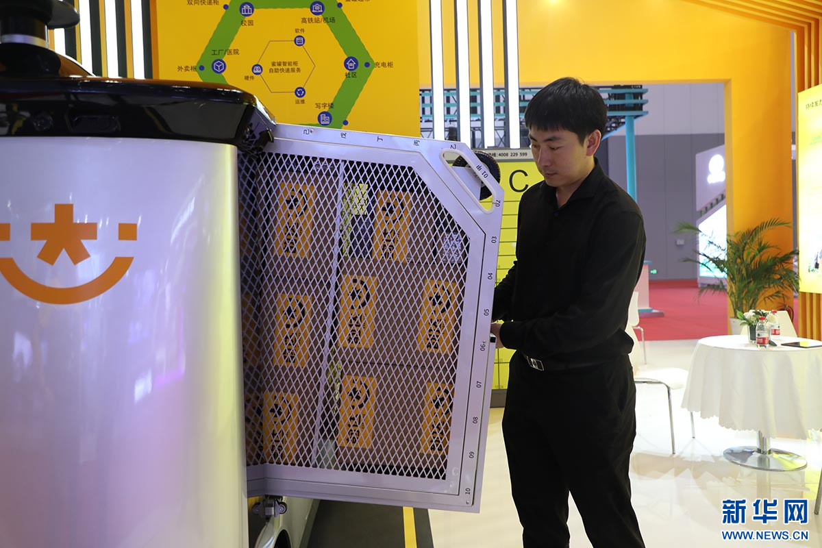 在仓储配送场景展区,工作人员介绍智能快递配送车。新华网 王立鹏 摄