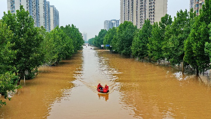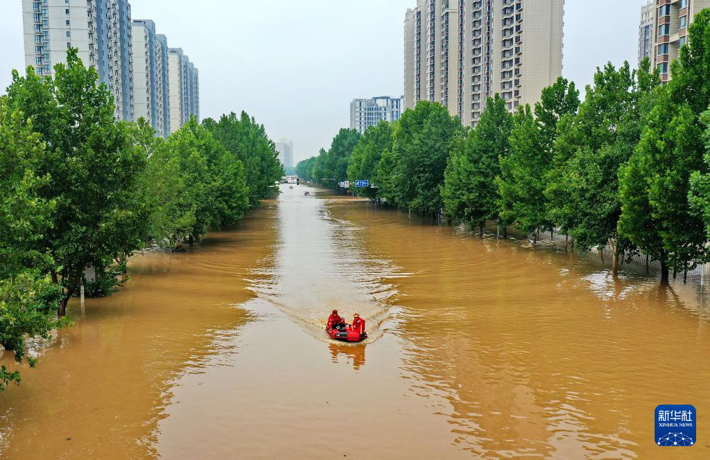 8月2日,救援人员在河北省涿州市市区乘坐冲锋舟前去转移受灾群众(无人机照片)。新华社记者 牟宇 摄