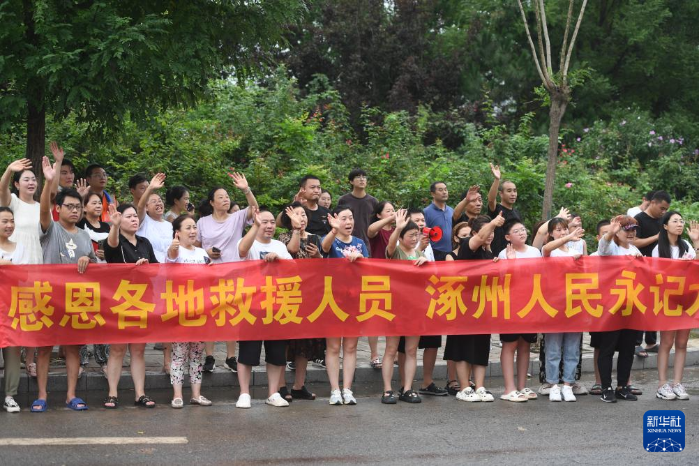 连日来,救援力量从全国各地驰援涿州,搭建“生命之舟”转移受困群众,完成任务后部分救援队开始撤离。从8月4日下午开始,涿州当地不少群众自发来到高速路口送别。不少群众眼含热泪,在“英雄豪杰,一路平安”等祝福话语中,与救援队告别。“一方有难,八方支援”,中国人民扶贫济困的传统美德和友善互助的核心价值观,在这个夏天再一次彰显。