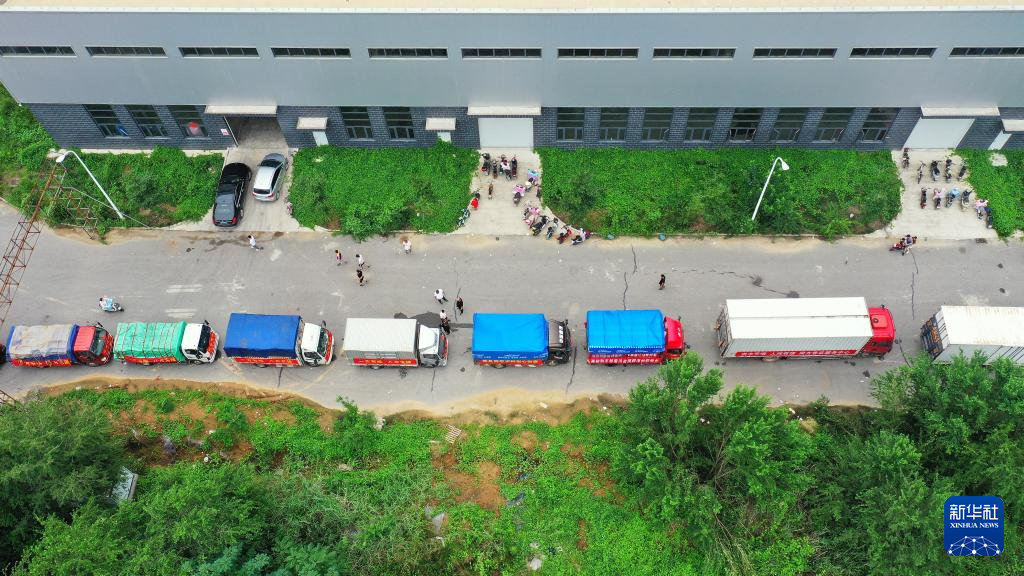 8月5日,在河北省涿州市钢研物资储备点外,运送物资的车辆排起了长队(无人机照片)。新华社记者 牟宇 摄