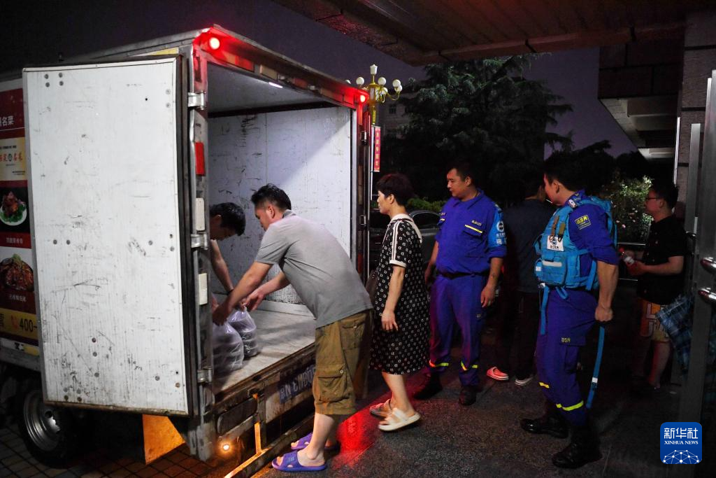 8月1日,河北省涿州市职教中心安置点的工作人员在运送饭菜,准备发放给安置群众。新华社记者 牟宇 摄