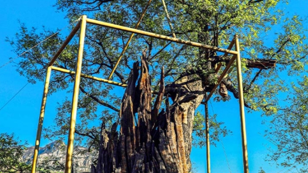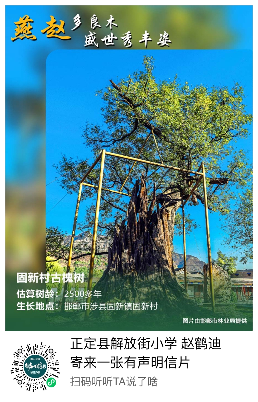 在邯郸市涉县固新村,有一棵久负盛名的古槐树。树高25米,胸围14米,冠幅11米乘13米。经专家鉴定,这棵树的树龄已经超过2500年。古树一侧中间空心,但东南方向的另一侧却枝繁叶茂,生机勃勃,形成覆盖面积半亩之多的新树冠。为了更好保护这棵古树,当地建成了古槐公园。