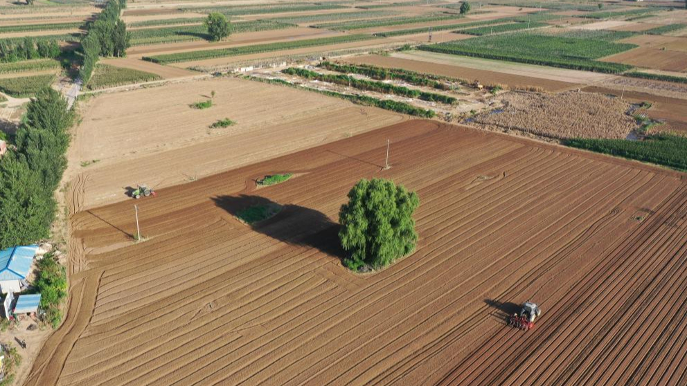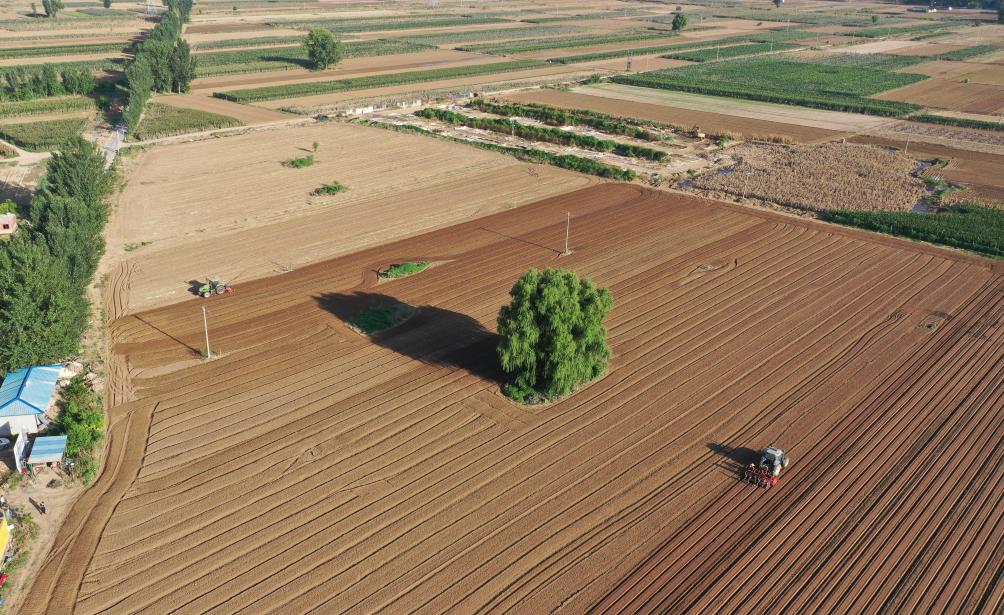 8月18日,工作人员驾驶农业机械在河北省涿州市刁窝镇潘各庄村进行灾后复耕补种(无人机照片)。新华社记者 骆学峰 摄
